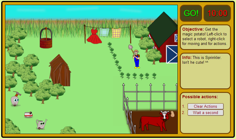 HOW TO PLAY: Left click a robot to select it. Every robot has an (internal) action queue. Right-click on the ground if you have a robot selected to add a move command, right-click on objects to add an action (pick actions in the bottom right panel). Left-click on objects to see their info. Click on GO! when you feel ready. Press 'A' to mute music.
